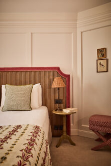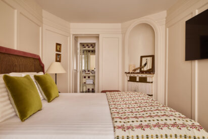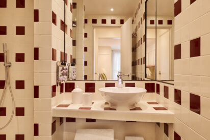 Un poêle en faïence historique se mêle aux moulures haussmanniennes en bois de l’ensemble. Des gravures d’époque vous rappellent le passé prestigieux d’une grande famille du quartier. Un bureau doté d’un mini bar et machine Nespresso, un dressing, de lourds rideaux au blanc immaculé laissent apparaitre de grandes fenêtres sur rue ou sur cour. Le velours des têtes de lit, faites à la main et sur mesure réchauffe l’environnement. Vous trouverez une charmante salle de bain, avec douche à l’italienne, les murs sont habillés de faïence de couleur bordeaux et crème.