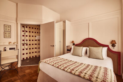 La chambre Supérieure au rez-de-chaussée, est accessible aux personnes à mobilité réduite. Le parquet en bois naturel réhausse la chambre dotée d’une grande fenêtre sur la rue Cardinet. Les moulures haussmanniennes habillent les murs surélevés d’une corniche. Une grande douche à l’italienne complète le confort de cette chambre.