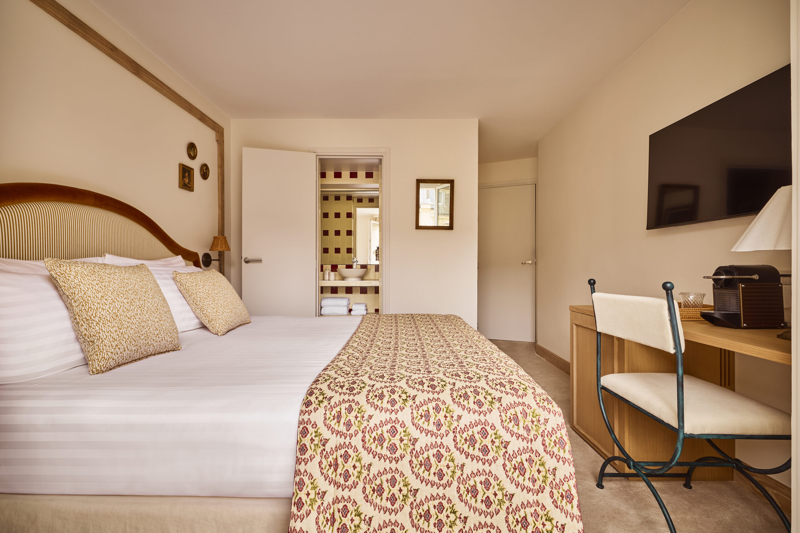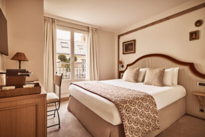 Un bureau doté d’un mini bar et machine Nespresso, un dressing, de lourds rideaux au blanc immaculé laissent apparaitre de grandes fenêtres sur rue ou sur cour. Le velours des têtes de lit, faites à la main et sur mesure réchauffe l’environnement. De nombreux cadres de famille agrémentent ce décor doux et réconfortant. Vous trouverez une charmante salle de bain, avec douche à l’italienne, les murs sont habillés de faïence de couleur bordeaux et crème. Niché au 5éme étage de l’hôtel, le balcon vous réserve un espace privatif doté d’une table et de chaises pour profiter d’un dernier verre ou d’un petit-déjeuner avec vue sur la rue Cardinet.